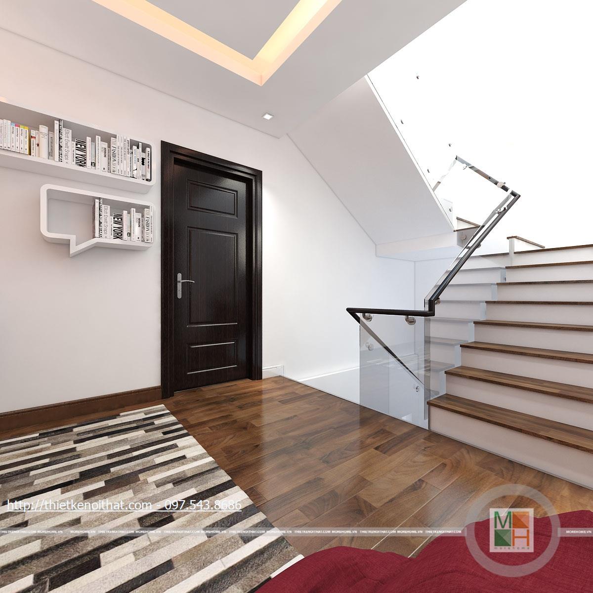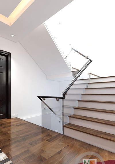 Với thiết kế cầu thang gỗ đổi chiều 180 độ, bạn có thể thấy mẫu thiết kế vô cùng ấn tượng bởi sự kết hợp tinh tế khi sử dụng chất liệu kính cường lực làm lan can khiến không gian trở nên sang trọng không kém. Bên cạnh đó là tay vịn gỗ nổi bật với gam màu trầm tạo sự pha trộn giữa nét cổ điển và hiện đại độc đáo.