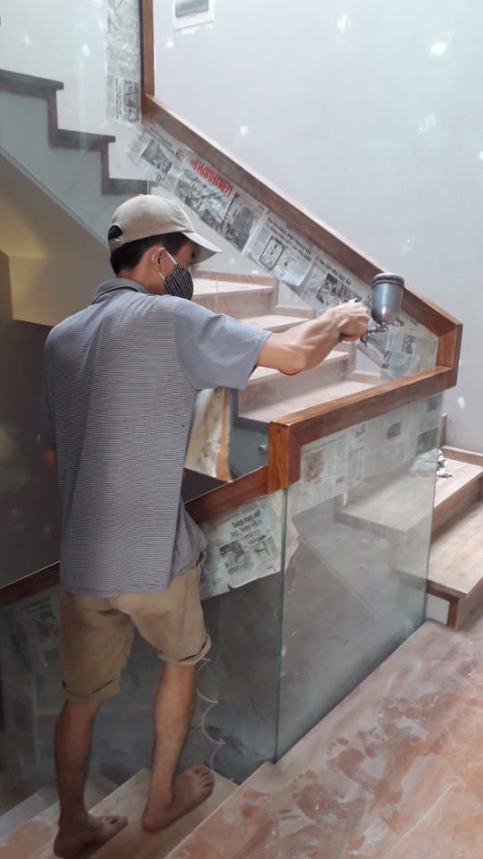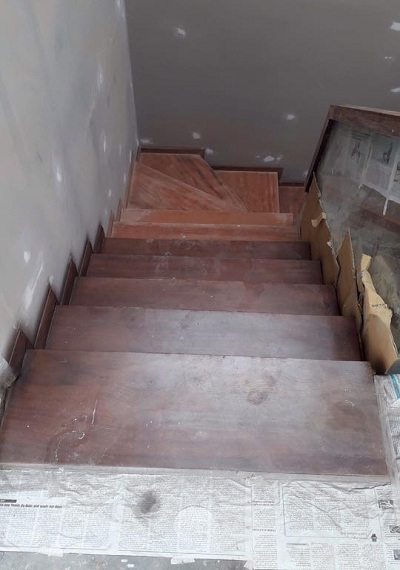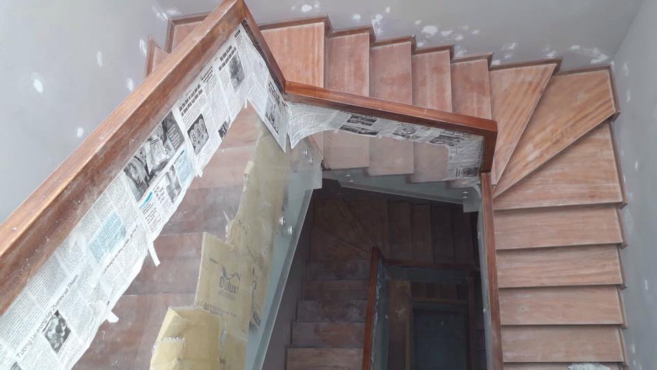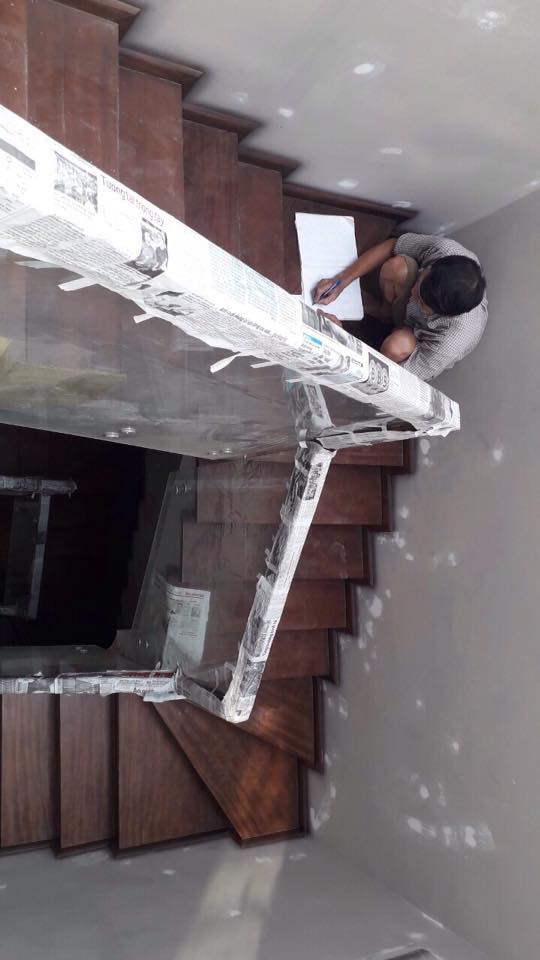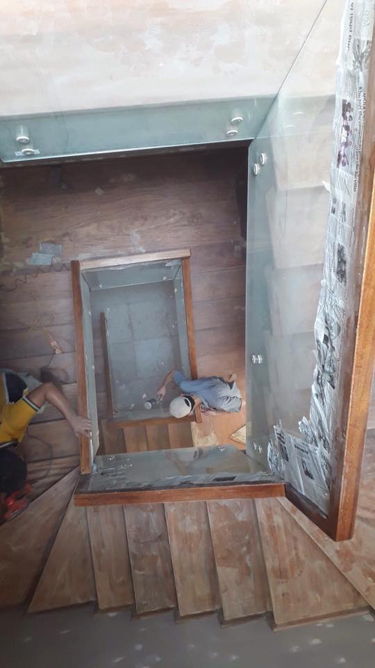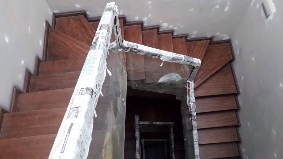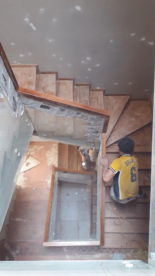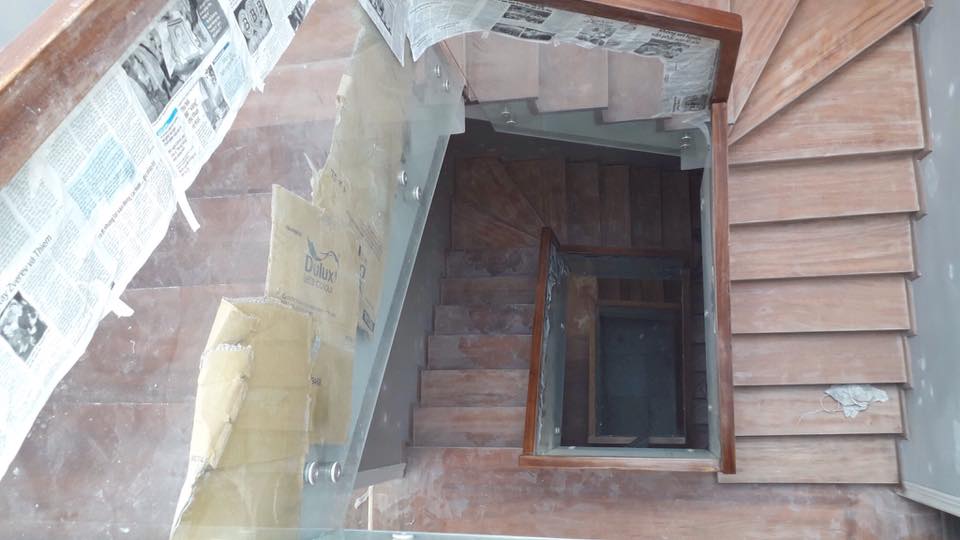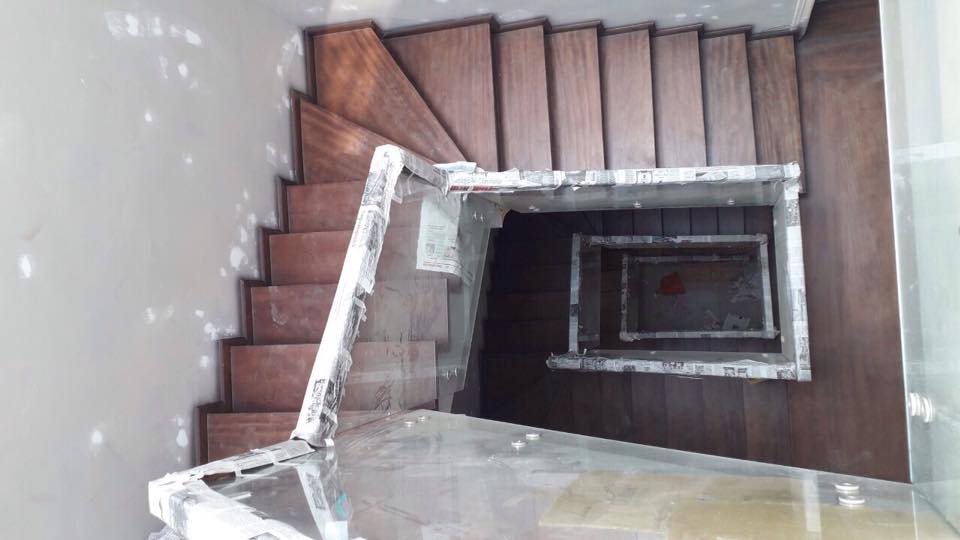 Thi công gỗ Lim Nam Phi cho nhà phố tại Hà Nội, công trình sử dụng lan can kính cường lực và tay vịn gỗ cao cấp
