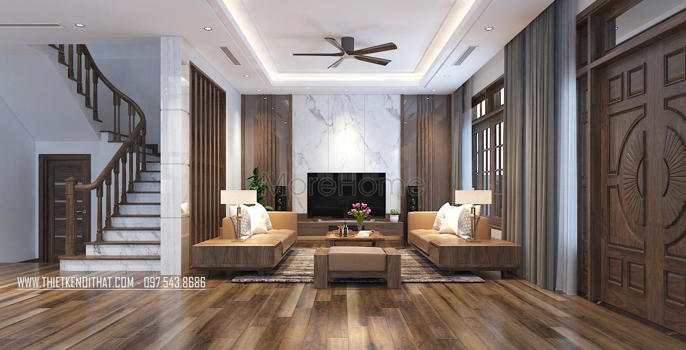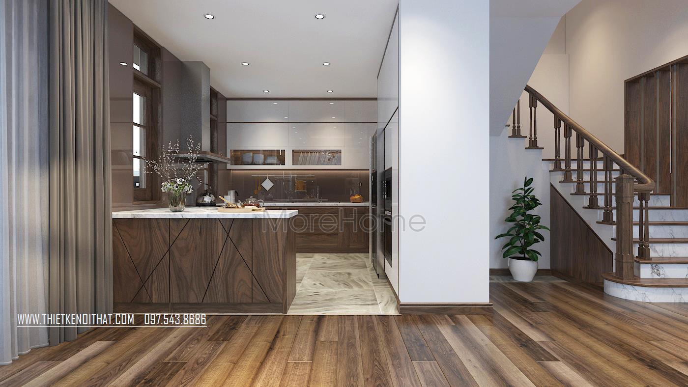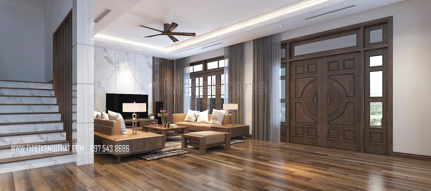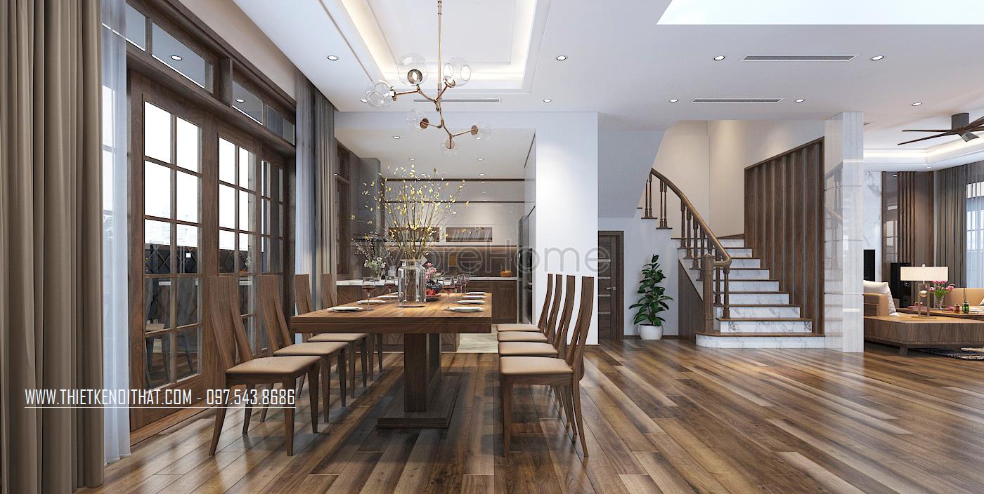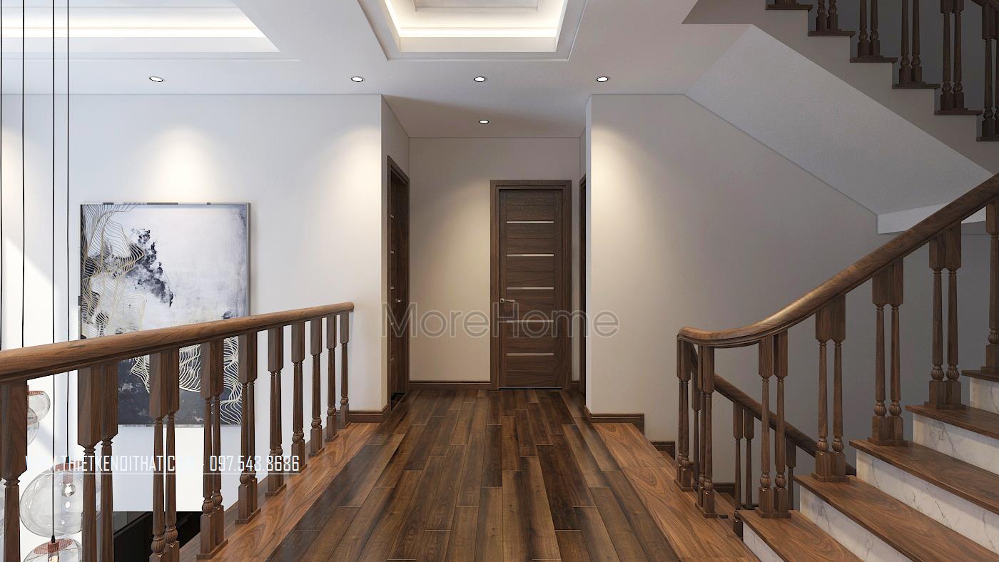 Mẫu cầu thang gỗ óc chó thể hiện được sự sang trọng, đẳng cấp trong không gian biệt thự tại Hà Đông - Hà Nội