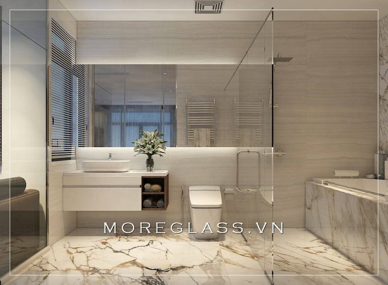 Mẫu thiết kế nội thất phòng tắm của căn hộ đẹp được sử dụng gạch men bóng và ốp tường đồng bộ để phản chiếu, giúp cho căn phòng trông rộng hơn.