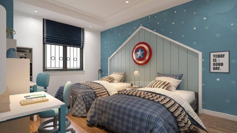 thiết kế nội thất phòng ngủ bé trai luôn sử dụng những gam màu nhẹ nhàng mang cá tính riêng vì thế mà màu xanh lại là màu rất được các bé trai ưa chuộng. Với diện tích đủ lớn mẫu bố trí nội thất phòng ngủ với giường đôi dành cho 2 bé trai sẽ là gợi ý lý tưởng cho các không gian như biệt thự, nhà phố, chung cư.